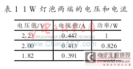 將電路完整搭建完畢后,測得1 W燈泡兩端的電壓和電流如表1所示。