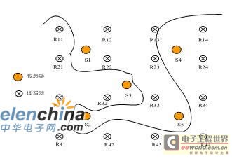 當一個攜帶標簽的移動目標如圖中所示由 移動到 ,兩點之間的直線被認為是目標移動的軌跡。因此,當目標沿著圖中的曲線運動時,由相應的RFID讀寫器確定其位置,相應順序激活的RFID讀寫器為: