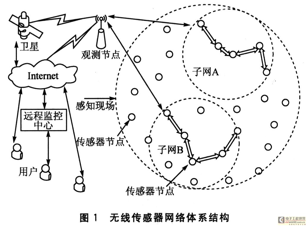 無線傳感器網絡是由大量部署在觀測環境中的微型、廉價、低功耗的傳感器節點,以無線、自組織的方式,通過多跳通信而快速形成的網絡系統。WSN的典型布撒是通過飛行器撒播、人工埋置和火箭彈射等方式來完成的。圖1給出了傳感器網絡體系結構一般形式的描述。