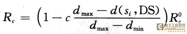 靠近基站的候選簇首的競爭半徑應該較小。隨著候選簇首到基站距離的減小,其競爭半徑亦應隨之減小。設候選簇首的競爭半徑的最大取值為R0c。其中,c用于控制取值范圍的參數,在0~1之間取值。候選簇首si確定其競爭半徑Rc的計算公式如下: