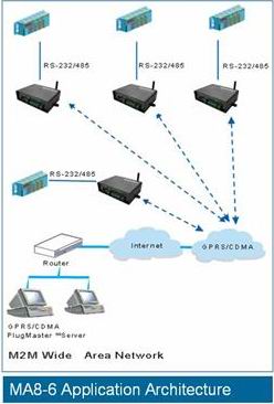 赫立訊科技所提供的WirelessPlug MA8-6 DTU產品是使用在機器對機器(Machine-to-Machine)應用的完整無線解決方案,包括MA8-6 DTU無線平臺及中心服務器的PlugMasterTM軟件。在硬件上MA8-6 DTU提供了工業標準的RS-232/RS-485接口及Digital I/O接口,可以針對各式的終端設備提供直接的串行連接,亦提供了圖形化PlugeneTM軟件,具有協議分析、數據收集及任務管理等功能,讓終端設備以TCP/IP方式經由GPRS網絡及Internet與原有應用系統連結。PlugMasterTM軟件除負責終端設備的認證管理外,亦做到IP管理、數據存取及數據交換,應用系統因此可經由GPRS網絡與遠程設備雙向無線溝通,并導入數據庫管理,數據可以定時匯出、查詢及刪除,也可以完整地保存聯機紀錄及系統信息。