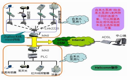 ——此系統可用GPRS+PLC、ZigBee+數據采集器/控制器等多種整合方案負責自來水泵控制和水泵相關數據采集。終端(自來水泵房等)的數據采集器等設備采集相關的參數如水壓、流量、溫度、PH值、報警等信息通過MA8(GPRS)或ZigBee網絡+MA8傳遞到遠端中心端;遠端中心端也可通過internet控制終端設備,如閥門開關等。此系統可使監控中心全面的掌握城市供水質量、渠道等方面的實時信息,預防供水渠道局部的堵塞、滲漏等事件的發生,最大程度的保障了市民日常用水充足穩定。