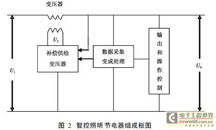 智控照明節電器組成框圖中的U1為市電輸入電壓,U2為主變壓器副邊電壓,U3為補償供給變壓器的輸出電壓(也是主變壓器的輸入電壓,或叫主變壓器的原邊電壓),U0為節電器的輸出電壓。