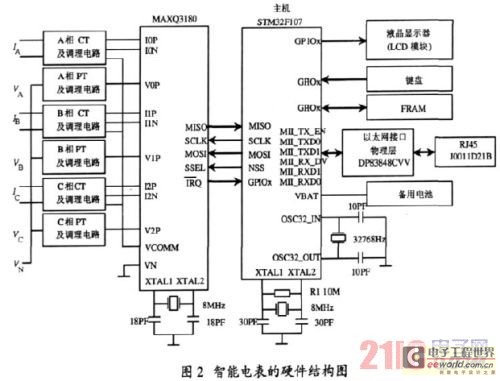 計量芯片選用Maxim生產的多功能低功耗計量芯片MAXQ3180,主機選用ST公司生產的STM32F107xx增強型ARM嵌入式控制器。由于STM32F107只具有10/100 Ethernet MAC,所以需外加10/100 Mb/s以太網物理層收發器DP83848CVV和RJ45連接器J0011D21B。這樣,智能電表可提供一個以太網通信接口,便于組成分布式通信網絡。