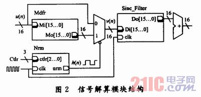 由于二次諧波磁通門信號一個周期采樣128點,因此N=128;按照圖3所示的信號流圖,128點sinc濾波器由127個加法器和128個寄存器組成。為防止溢出,加法器和寄存器寬度為16+log28=24位,最后一級輸出的高16位作為濾波器的輸出。實現了低通濾波的功能。