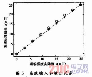 使用雙鐵芯結構磁通門探頭感應被測磁場,磁場強度從0μT變化到25μT。首先去掉積分模塊打開反饋回路,對開環結構的前向通道進行測試,然后加入積分模塊和閉合反饋回路,對閉環系統進行測試。兩次實驗的輸入/輸出關系如圖5所示,圖中“o”是開環結構的結果,“+”是閉環結構的結果。