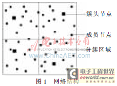 在本方案中,網絡區域被基站劃分為若干大小相等、固定不變的的網格,每個網格形成一個簇,每個簇有一個輪換選出的簇頭節點,如圖1所示。節點在網絡中的位置是已知的,節點形成簇是基于它們的位置。簇區域的劃分是在簇頭選舉的第一輪進行,在整個網絡生命周期[FS:PAGE]內不再變動。從第二輪開始,不再需要基站的任何控制信息,極大地減少了在初始化階段與基站的通信量。