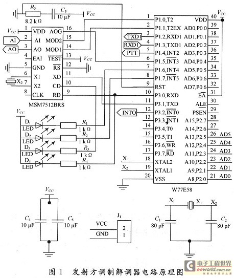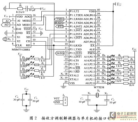 系統使用+5 V的電源由無線電臺的電池變換后供給。MSM7512 B使用專用的3.579 545 MHz的晶體,由于其內部有接地電容,不用外接補償元件;單片機使用頻率為11.059 2 MHz的晶體,主要是為了在波特率設置時,可以取得準確的波特率,能有效避免定時器工作產生的積累誤差,外接的補償元件是二個30 pF電容。為了防止單片機程序運行時的誤操作,應將單片機EA/VPP端(31腳)置高電平,確保單片機訪問內部的程序存儲器。由于調制解調芯片MSM7512B和單片機W77E58都支持TTL電平,所以單片機的第一串行通信口TXD,RXD可以直接與MSM75125B的XD和RD相連;單片機的P1.0,P1.1分別連接:MSM7512B的MOD2和MOD1,按通信的要求,在收發之間轉換,以控制調制解調芯片的工作狀態;P1.4則控制無線電臺收/發狀態的轉換(PTT)。MSM75125B的AO和AI分別通過接口電路與無線電臺的送/受話器相連。作為系統外部監視的顯示電路全部由發光二極管和電阻構成,其中紅色發光二極管D1為電源指示,亮則表示系統的初始化過程正確;黃色發光二極管D2為發送正確指示,系統每正確完成一次數據發送任務,它應閃爍一次;D3為載波檢測指示,如果亮則表示調制解調器檢測到了信道中[FS:PAGE]的有效載波信號;D4為數據傳輸指示,系統在發送數據時它就開始閃爍,直至數據發送完畢。如果前端傳感器有數據需要傳送時,產生一個下降沿脈沖,觸發單片機的外部中斷INTO(P3.2),單片機響應中斷后,將前方來的8位并行數據由P2口(P2.0~P2.5)讀入,由于P2口內部有上拉電阻,因此作為輸入口時,可用TTL或MOS電路驅動,而不要外加上拉電阻。W77E58的串行通信口2可留作系統的擴展口備用。