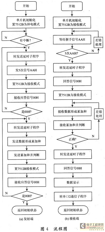 在系統的設計過程中,為了減少電臺靈敏度不高和信道質量差誤碼等影響,發送方需連續發5次“握手”聯絡信號,接收方在連續2次收到正確的聯絡信號以后,才確認是有效的聯絡予以響應,否則認為是干擾信號,不予以響應。這樣既能減少各類原因造成的接收機程序不啟動運行導致漏報的可能性,又能保證接收機不因干擾信號而誤操作,減少誤報的機率。另外綜合考慮電臺的收發轉換和調制解調芯片的收發轉化所需的各類延時時間,在設計程序時專門安排了一個延時時間。經過大量的實驗,得出一個比較合適的延時時間,即不論通信哪一方,在由收轉為發狀態后,都先延時70 ms,因為時間太短了系統不能正常工作,太長了可能會影響數據的傳輸速率,降低數據傳輸的時性。系統數據發射端和接收端單片機程序流程圖如圖4所示。