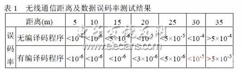 對無線傳感器網絡接收節點接收數據有效性的測試,必須通過驗證系統的性能進行,在一定距離內進行系統通信測試時,判斷數據傳輸的可靠性和有效性[5]。在對網絡接收節點的T5743 芯片完成輸入輸出波形和電路邏輯的時序檢測后,將無線網絡接收節點與PC 機相連,改變發射端與接收端之間的距離,測試通訊距離及相應的誤碼率。設計中將發射端以5kB 的數據速率發送20062120133~20062240266 均勻遞增的測試數據,誤碼測試程序將接收到的數據與自己生成的數據序列(20062120133~20062240266)同步、對比測得誤碼率。表1 為接收節點的數據誤碼率測試結果。