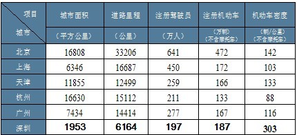 表1:北京、上海、天津、杭州、廣州、深圳道路交通管理基礎數據對比表