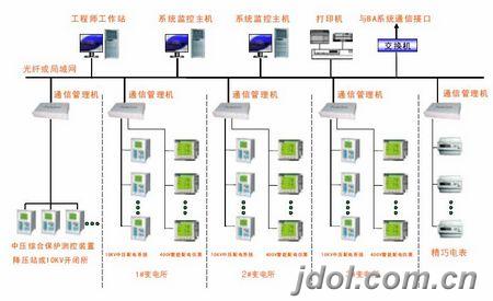 在不考慮其它因素的前提下,項目規模往往是確定網絡拓撲結構的首要因素。智能電力監控系統首先要滿足系統的基本運行要求,還需滿足系統的可擴展性,但是應避免設計余量過大,造成項目投資過大,帶來不必要的浪費。設計前對項目進行深入的了解,考察項目的一次設備分布、距離間隔與設備數量。一次設備分布及距離間隔是確定通訊間隔層通訊子站數量的依據,一個子區域的設備數[FS:PAGE]量是確定通訊子站類型及通訊接口的依據。項目整體設備數量與子站數量是確定主站層結構的依據。典型的系統結構有集中監控系統模式,區域供電集中監控系統模式以及光纖自愈環網集中監控模式。如圖2是區域供電集中監控系統模式的示意圖。