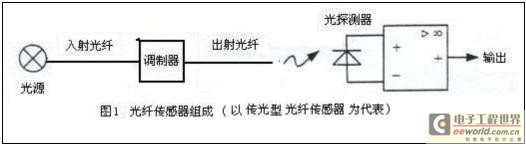 光纖傳感器一般是由光源、接口、光導纖維、光調制機構、光電探測器和信號處理系統等部分組成。來自光源的光線,通過接口進入光纖,然后將檢測的參數調制成幅度、相位、色彩或偏振信息,最后利用微處理器進行信息處理。概括光纖傳感器一般由三部分組成,除光纖之外,還必須有光源和光探測器兩個重要部件,見圖1所示。