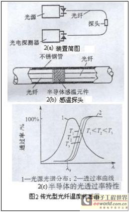 位圖2(a)為半導體吸光型(傳光型)光纖溫度傳感器示意圖。將一根切斷的光導纖維裝在細鋼管內,光纖兩端面間夾有一塊半導體感溫薄片(如GaAs或InP),這種半導體感溫薄片透射光強隨被測溫度而變化。因此,當光纖一端輸入一恒定光強的光時,由于半導體感溫薄片透射能力隨溫度變化,光纖另一端接收元件所接受的光強也隨被測溫度而改變。于是通過測量光探測器輸出的電量,便能遙測到感溫探頭2(b)處的溫度。