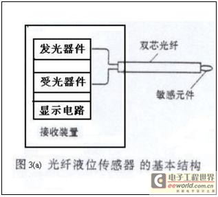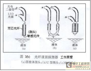 圖3(a)所示為光纖液位傳感器的基本結構[FS:PAGE]。這種傳感器的敏感元件和傳輸信號的光纖均由玻璃纖維構成,故有絕緣性能好和抗電磁噪聲等優點。