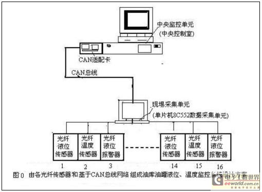 圖0所示可知,監測系統分別由中央控制式的中央監控單元和現埸采集單元(或數據采集單元)組成。現埸采集單元對油罐的液位、溫度信號進行數據的實時采集,同時完成數據統計、存貯;中央監控單元可以定期或不定期地從現埸采集單元獲取數[FS:PAGE]據并完成圖像監測、數據統計、報表、打印及數據庫管理。而中央監控單元和現埸采集單元之間通過CAN總線連接在一起,在這個網絡中,中央監控單元處于主控位置,而現埸采集單元可以隨時響應中央監控單元的命令。其現埸采集單元由單片機8C552及采集、存儲、顯示、遙控和通信模塊組成,每個現埸采集單元可與光纖液位傳感器、光纖溫度傳感器及光纖液位報警器等16個設備相接。之所以應用CAN總線網絡結構是內由于CAN網絡具有的方便靈活、突出特性,抗干擾性、可靠性、實時性等特點。所有的光纖液位傳感器、光纖溫度傳感器及光纖液位報警器都可以通過一對雙絞線串接在一起,節省了空間、簡化了布線。