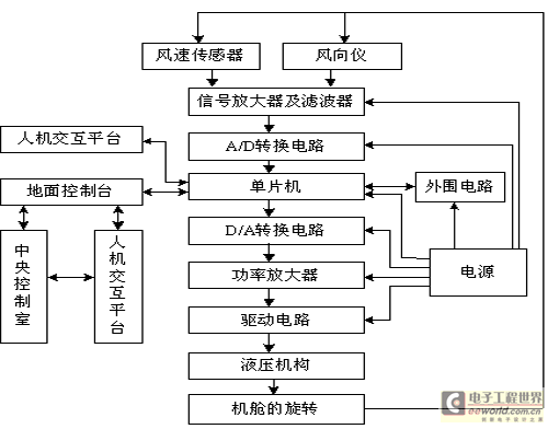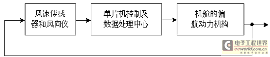 由于空氣動力學的隨機、不確定性,很建立一個確定的關于風力和風向的數學關系式,為了達到最佳的控制效果,我們采用了模糊控制算法。其系統控制原理圖如下: