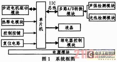 本系統主要以單片機總控制為核心,由微弱聲音放大檢測、可見光檢測、步進電機旋轉熱釋電紅外傳感器、A/D轉換、液晶顯示等模塊以及控制電路組成。系統框圖如圖1所示。
