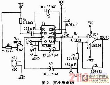 從麥克風接收到信號后由三極管9013初次放大,然后由集成放大器LM324的兩級放大,得到交流電壓。由于模數轉換時需要直流電壓值,所以再通過萬用表交直流轉換電路,選用整流芯片AD736,使用單電壓供電低阻抗電路。