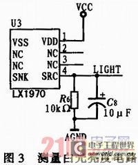 可見光檢測模塊采用LX1970作為核心芯片。LX1970是美國微型半導體(Microsemi)公司推出的一種能實現人眼仿真的集成化可見光亮度傳感器。該模塊采用測量白光亮度電路(如圖3)。利用src端輸出光-流轉換的結果,然后實現流壓轉換。該芯片性能穩定,靈敏度極高。