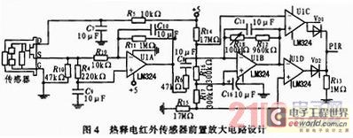 熱釋電紅外傳感器能以非接觸形式[FS:PAGE]檢測出人體輻射的紅外線,并將其轉變為電壓信號。本設計所采用的是PIR熱釋電傳感器,安裝有菲涅爾透鏡,感應距離7 m,感應角度110°。具有全自動感應、光敏控制、兩種觸發方式(不可重復觸發方式,可重復觸發方式)、靈敏度高、微功耗等特點。當人進入其感應范圍,則輸出高電平,人離開感應范圍,則自動延時關閉高電平,輸出低電平。但是該熱釋電紅外傳感器只能檢測到動態,所以對于長時間處于相對靜態的存在無法檢測的缺陷。熱釋電紅外傳感器前置放大電路如圖4所示。