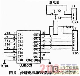 為此,采用了步進電機模塊。設計中,將熱釋電紅外和步進電機固定一起。單片機P1.0~P1.3口分別經過74LS14雙上升沿D觸發器電平轉換后,通過芯片ULN2003驅動步進電機旋轉(電路設計如圖5),從而可以旋轉熱釋電紅外傳感器,檢測到靜態。