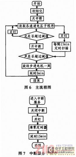 本系統以單片機AT89S52為核心,采用光照檢測、聲控以及步進電機旋轉熱釋電紅外等傳感器進行環境探測。系統首先啟動可見光模塊,通過光一流一壓轉換后,經過A/D轉化為數字量并通過液晶顯示。若是電壓較小,說明了亮度不夠,則繼續檢測聲音。若是聲音較大,則在短時間內調用步進電機模塊,檢測是否有人;否則,每隔15 min定時檢測。因為在實際過程中,設置聲光的閾值都缺乏直觀性,所以使用液晶電壓顯示進行判斷。光、聲的閾值可以根據不同地方的實際情況通過軟件進行調整。