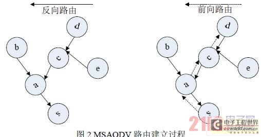 由于MSAODV 路由協議是對AODV 協議的改進演化,所以MSAODV 路由協議的操作 與AODV 路由協議的操作大同小異,為了清晰起見,對MSAODV 協議的操作做一詳細的介紹 還是有必要的。