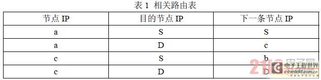 網絡中的每一個節點都有這樣的一個路由表,該表保存了對應節點的路由信息,由于各個 節點在網絡中的位置不同,因而他們的路由表項也不相同,例如在圖2(b)中,a 節點的路由表有 兩項,c 節點的路由表也有兩項,如表1 所示。
