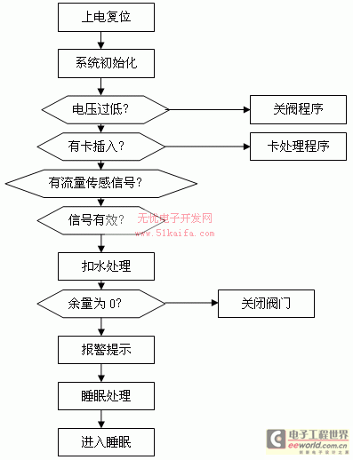 IC卡智能水表軟件設計的關鍵是看門狗的初始化、進入睡眠及其喚醒等處理部分。從功能來看,有這樣一些模塊:IC卡接口模塊(包括IC卡有效性判斷及讀[FS:PAGE]/寫IC卡)、閥門控制模塊、流量脈沖、用水量處理模塊及顯示模塊等。其框架如圖三。