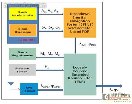 &nb[FS:PAGE]sp; 當天線沒有被遮擋時,GPS接收器的絕對定位精度是3m到20m,這個參數在一段時期后不會發生漂移。基于MEMS傳感器的捷聯式慣性導航系統(Strap-down Inertial Navigation System,SINS) 可在很短時間內提供精確的定位信息。但是,根據運動傳感器的性能,這種導航系統在使用一段時間后很快就會發生精度漂移現象。行人航位推算系統(Pedestrian Dead Reckoning,PDR)是一個根據步長和方位計算從室內已知初始位置開始的行走距離的相對導航系統,雖然定位精度不會隨時間推移而發生漂移,但是需要在受磁力干擾的環境內保持航向精度。此外,GPS需要對步長進行校準,才能達到可以接受的定位精度。