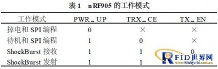 如表1所示,nRF905有2種(zhong)工作模(mo)式和2種(zhong)節能模(mo)式,由(you)PWRUP,TRXCE,TXEN三個引腳控制(zhi)(zhi)。由(you)于采用先進的 ShockBurst技術,使得數據能夠(gou)在(zai)微(wei)控制(zhi)(zhi)器(qi)(qi)中(zhong)低速處理,在(zai)nRF905中(zhong)高速發送,中(zhong)間有很(hen)長的空(kong)閑(xian)時(shi)間,因此(ci)能夠(gou)節約存儲器(qi)(qi)和微(wei)控制(zhi)(zhi)器(qi)(qi)資源,減少編程時(shi)間。