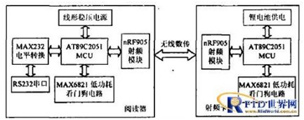 圖2 采用nRF905的(de)主(zhu)動式RFID系統硬件(jian)設計框(kuang)圖