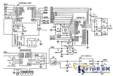系統(tong)電路(lu)(lu)硬件(jian)(jian)主要(yao)分為射(she)(she)頻接口和控制系統(tong)2大部分。本(ben)設(she)計中射(she)(she)頻接口即為nRF905射(she)(she)頻模塊(kuai)(包含(han)外圍元(yuan)件(jian)(jian)及(ji)PCB環形天線),控制電路(lu)(lu)基于51系列微控制器(qi)搭建。