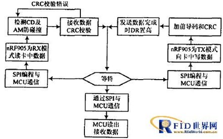nRF905作為閱讀器與射頻卡的通信接口,采用半雙工方式通信,在發射和接收模式間切換需要等待550μs的穩定時間。RFID系統中無線通信的軟件流程如圖4所示。