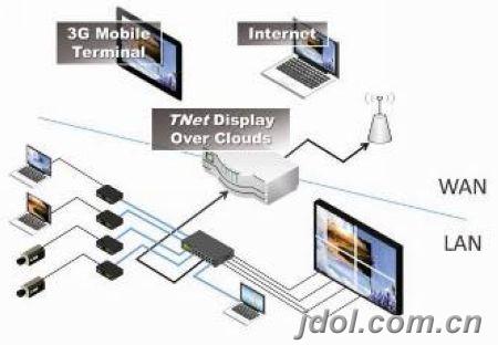 TNet系統中加入一(yi)云三端服務器(qi),就(jiu)可以實現大屏(ping)幕圖像在互聯網內移動終端上的回顯。服務器(qi)通過(guo)網線連入TNet內網(LAN)抓取大屏(ping)圖像,并有內置的無限模(mo)塊將數據(ju)在廣域網(WAN)上廣播發出。