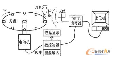 本系統硬件工作平臺的結構組成主要包括:刀庫工作系統、射頻識別系統、上位機管理軟件和便攜式微控制器。其中,刀庫系統選用圓形刀盤回轉裝置,由步進電動機驅動運行,硬件工作平臺如圖1所示。