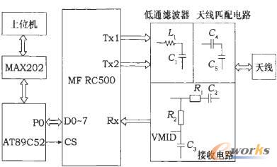 系統電路圖主要包括3個部分:MCU處理器、RC500內部電路和外部電路。MCU與RC500為并行連接AD。RC500內部電路主要包括發送部分、數字部分以及8位并行口。外部電路包括一個低通濾波器、接收電路、天線匹配電路和天線。低通濾波器根據國際電磁兼容性(Electro Magnetic Compatibility,EMC)條例對發射波中更高的諧波進行濾除,由元件L1和C1。組成。接收電路由元件R1、R2、R3和R4組成。RC500內部產生的VMID電勢作為腿腳的輸入電勢,兩者之間連接一個分壓器,在VMID引腳處再接一個對地電容c3提供穩定的參考電壓。天線匹配電路由元件C4、C5組成。刀具射頻識別系統主框圖如圖2所示。