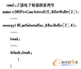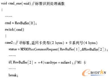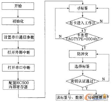 軟件系統包括主程序、串口中斷程序和發射子程序。主程序為順序結構,完成串口、中斷初始化設置;串口中斷程序接受上位機命令,配置RC500內部寄存器;發[FS:PAGE]射模塊進入發射狀態,讀寫器通過防沖突算法分時選擇一個標簽進行讀取,實現標簽的識別,耗時短。這里給出標簽識別操作的程序片段,軟件流程如圖3所示。