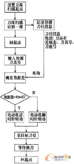 為了驗證系統功能,設計了一個具有8刀位(間隔45度)的圓盤回轉裝置,隨機存放刀具。RFID系統初始對應的刀位設為識別起點。系統啟動,刀盤從當前起點開始隨步進電動機控制每轉動45度,RFID識別當前刀具標簽,每次識別的信息傳給微處理器存于刀位信息數組,數組包含刀座和刀具對應信息。RFID將一圓周識別完后,回到識別起點。此時,微處理器端的鍵盤輸入所需的刀具號,微處理器內部算法運行,查找刀位數組中與輸入刀具號信息匹配的刀位,并計算該刀位與識別起點的角度差(角距)。角距值為n*45度(n=0~7)。再根據n的取值,判斷電動機如何旋轉才能最快到達目標刀具。接著,RFID讀寫器將所對應刀具信息的核心參數在液晶顯示器上顯示。隨后便等待取刀,工作完成后RFID系統將重回識別起點,整個識別過程運轉快速簡便。系統換刀流程如圖5所示。