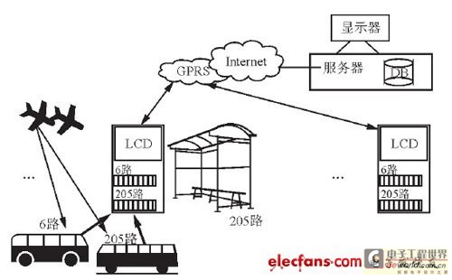 電子站牌收到公交車發來的信息后, 將通過GPRS-DTU發送到監控中心, 然后由監控中心將所有公交車發來的信息通過Internet發送給站牌。