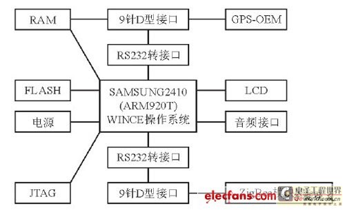 ARM嵌入式處理器是整個車載終端的核心,可通過各種接口與各功能模塊相連接。本車載終端選用韓國三星公司的一款基于ARM920T內核的16/32位RISC嵌入式微處理器S3C2410.S3C2410的運行頻率可以達到203 MHz, 主要面向手持設備等高性價比、低功耗的應用。