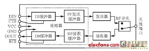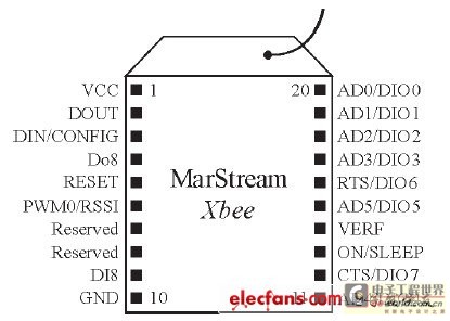 圖3所示是(shi)XBee Pro模塊(kuai)的(de)(de)引(yin)(yin)腳(jiao)(jiao)排(pai)列圖, 該模塊(kuai)有20個引(yin)(yin)腳(jiao)(jiao)。RS232接口電路(lu)板(ban)的(de)(de)引(yin)(yin)腳(jiao)(jiao)可(ke)連接到VCC、GND、DOUT和DIN引(yin)(yin)腳(jiao)(jiao)。其中(zhong)VCC是(shi)電源引(yin)(yin)腳(jiao)(jiao)(2.8~3.4 V); GND接地(di); DIN是(shi)信號(hao)輸(shu)入引(yin)(yin)腳(jiao)(jiao), 可(ke)作為UART數據(ju)輸(shu)入, 通(tong)常與處理器(qi)的(de)(de)UART接收端(duan)TX相連; DOUT為信號(hao)輸(shu)出引(yin)(yin)腳(jiao)(jiao),可(ke)作為UART數據(ju)輸(shu)出, 通(tong)常與處理器(qi)的(de)(de)UART接收端(duan)RX相連。此外, 在XBee/XBee Pro模塊(kuai)中(zhong)還集(ji)成了一個UART接口, 該接口的(de)(de)內部數據(ju)控制流程如圖4所示。