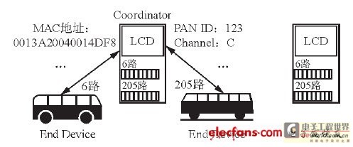 即把分布在公交線路上的電子站牌配置為ZigBee協調器, 而將到達的公交車配置為ZigBee終端設備。圖5所示是公交車與站牌的組網方式。當站牌上ZigBee網絡協調器選擇一個信道和PAN ID并啟動時, 便建立了一個ZigBee個人局網(PAN)。