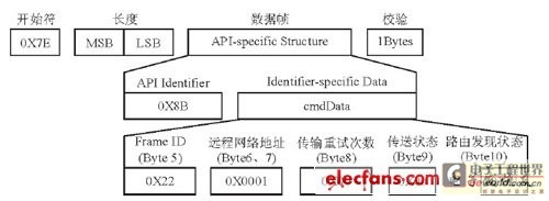 其中的Bytes 9為傳送狀態信息, Bytes6、7為接收模塊的16位網絡地址。
