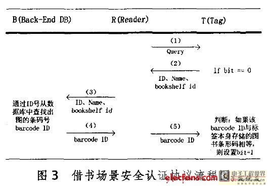 借書場景的認證協議的前兩步與排架場景認證協議相同。在借書的過程中,管理系統需要做借書操作,此外,標簽還要把其狀態位bit設置為1,以表示圖書處于借出狀態。該協議通過由讀寫器給標簽發送圖書的條碼號(barcode lD)作為驗證信物,驅使標簽修改狀態位的值。協議執行過程如圖3所示。