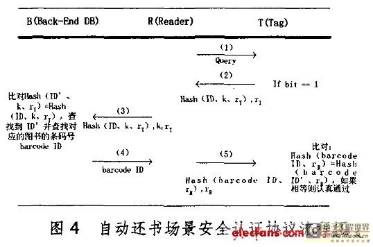 3、Tag讀寫器將Hash(ID、k、rT)、k和rT發送給后臺數據庫。后臺數據庫查找是否存在一個lD、(數據庫中存儲有所有Tag的ID)使得Hash(ID、k、rT)= Hash(ID、k、rT)成立。如果有,則可鑒別該Tag是合[FS:PAGE]法標簽,并根據該ID查找圖書的條形碼barcode ID。如果沒有,則返回給Tag讀寫器認證失敗信息。