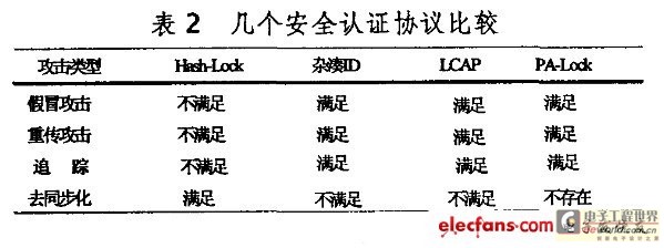 RFID系統所面臨的常見安全威脅包括假冒攻擊、重傳攻擊、追蹤、去同步化等類型。本文基于這些常見的攻擊類型,對Hash—Lock協議、基于雜湊的ID變化協議、LCAP協議及PA-Lock協議的安全性能在文獻8的基礎上進行了詳細的比較分析,分析結果如表[FS:PAGE]2所示。由于基于雜湊的ID變化協議和LCAP協議是動態ID協議,標簽ID在不停的刷新,這就存在去同步化的問題(即標簽內ID與其在數據庫內ID不一致):而Hash-Lock協議和PA-Lock協議是靜態ID協議,不存在lD不一致的安全威脅,但是Hash-Lock協議的安全性問題基本沒有解決, 本文提出的PA-Lock協議較好的解決了假冒攻擊、重傳攻擊、追蹤等安全問題。