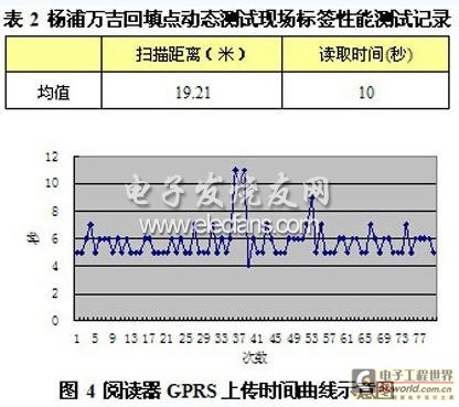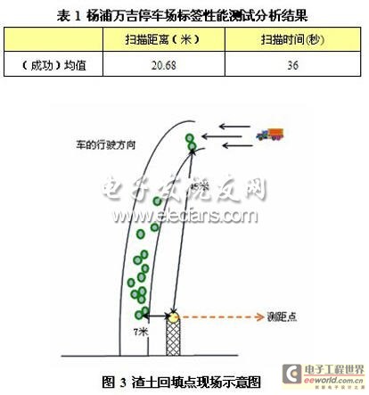 在渣土回填點現場,利用閱讀器讀取運動車輛上標簽,為統計讀取時間,在本測試中關閉GPS功能,只保留RFID模塊中的無線通信模塊,現場示意圖如圖3所示,標簽性能統計結果表2所示。