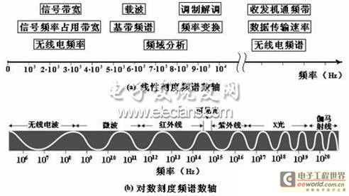 1、線性標度:此時為一有原點的射線數軸。射線數軸的原點對應于頻率為“0”的直流電,射線數軸的方向指向頻率增大方向。線性標度的電磁頻譜圖的概念非常清晰,但其表示頻率范圍的能力有限。如圖1中(a)圖所示。